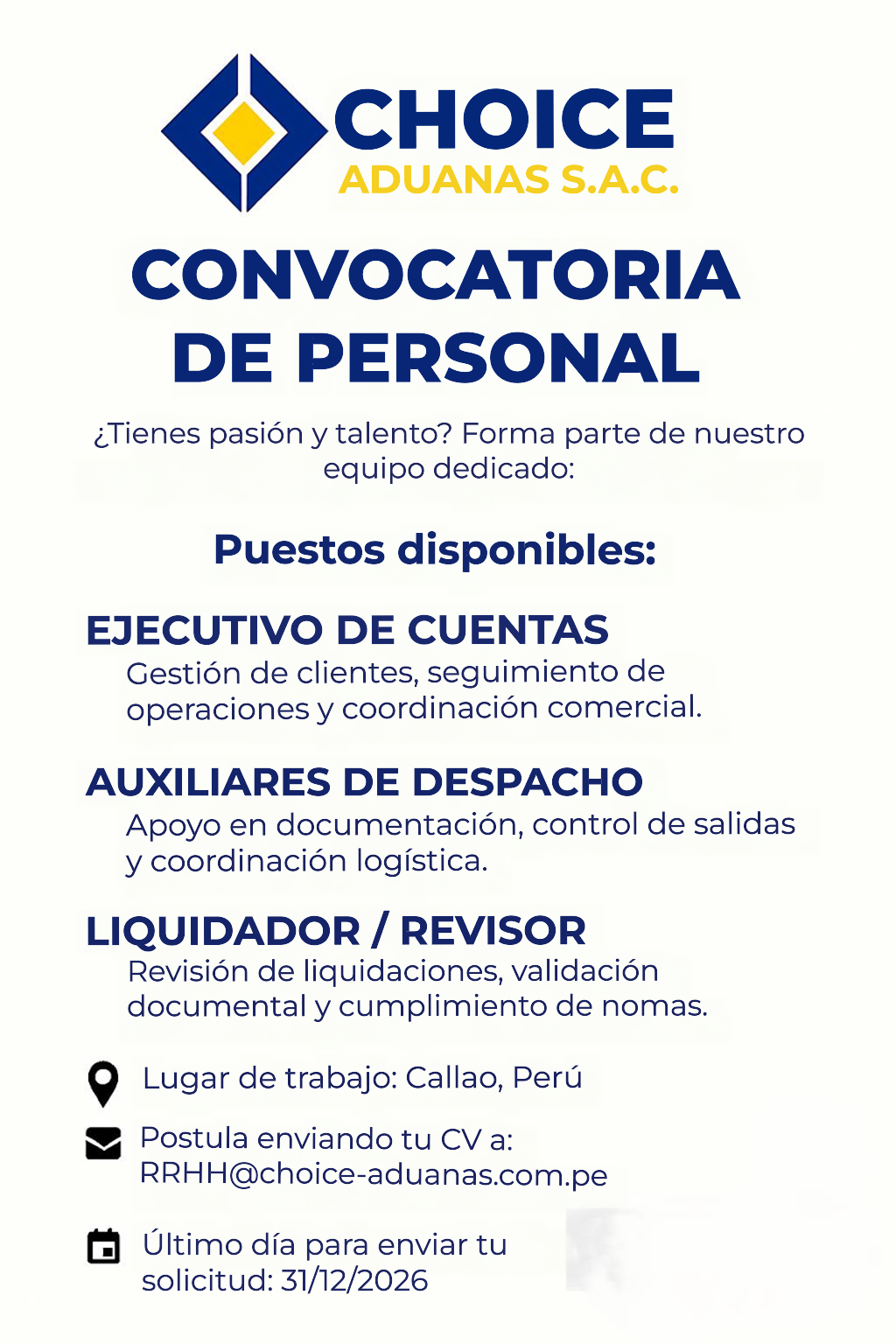 calidad@choice-aduanas.com.pe y auxiliar@choice-aduanas.com.pe